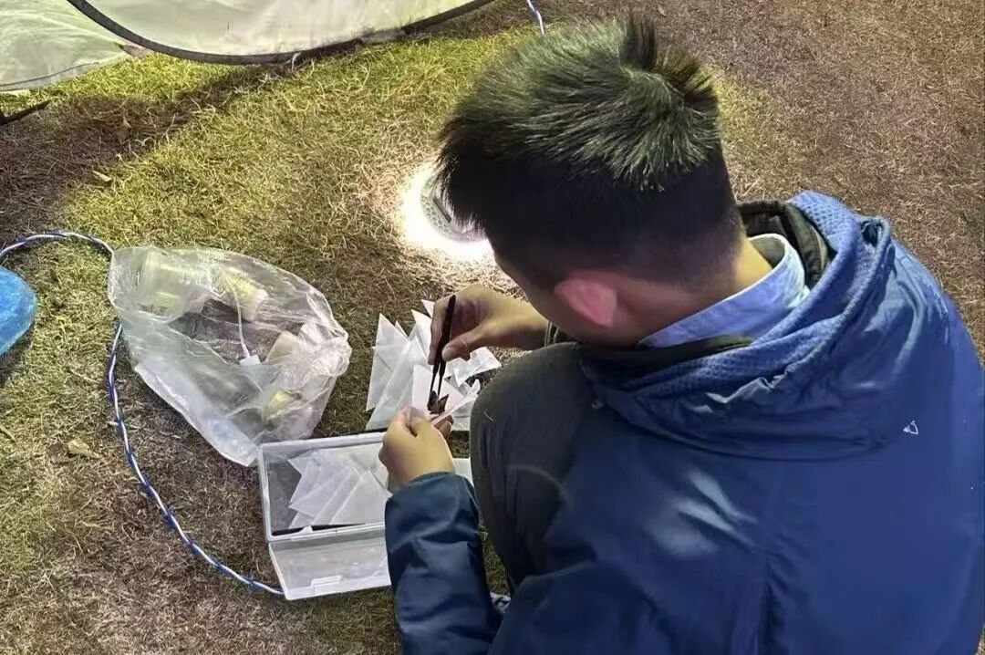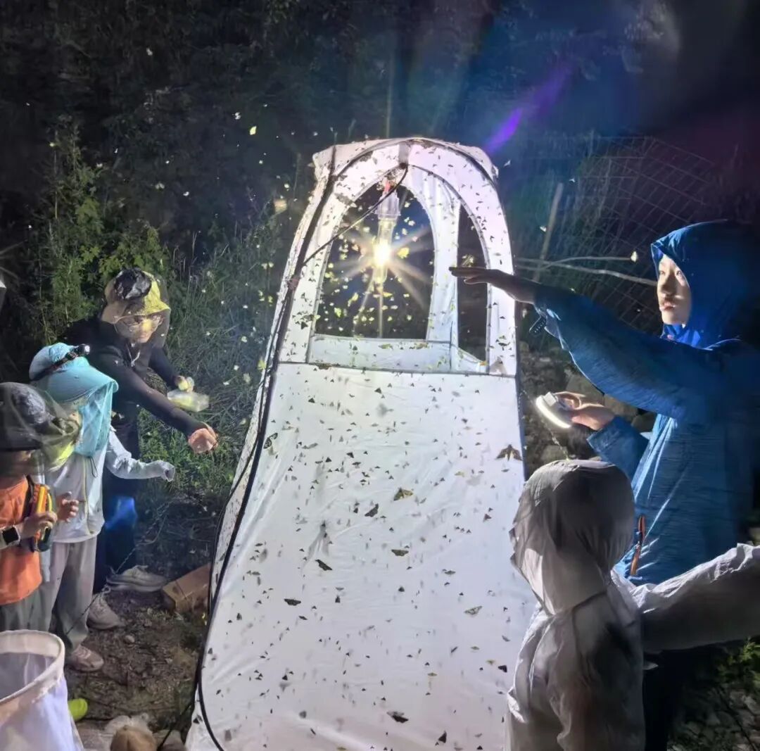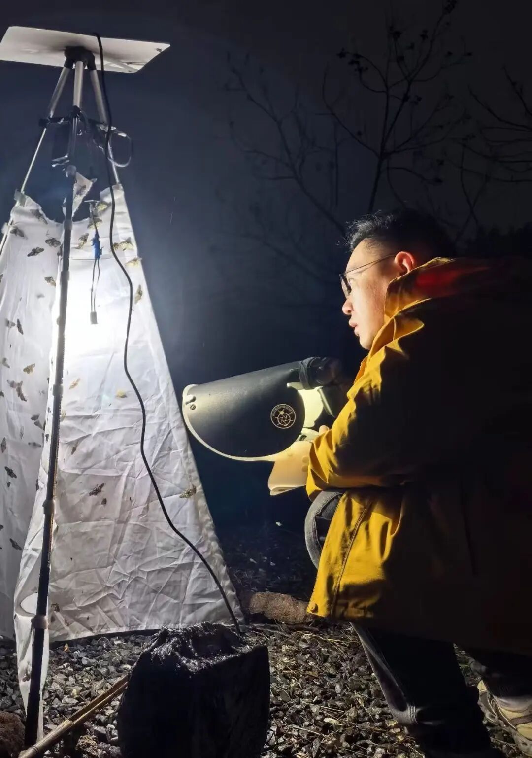 时间要回到2025年11月23日,浦东新区青少年活动中心张宁昆虫工作室团队成员张宁和团队前往浙江莫干山考察。彼时已是深秋,夜间气温只有八九度——按照常理,蛾类在气温低于12度时便很少活动,这个季节本不是灯诱的“常规档期”。张宁老师原本也没抱太大希望,但多年养成的习惯让他还是顺手带上了灯诱装备,到了之后便照例布灯。