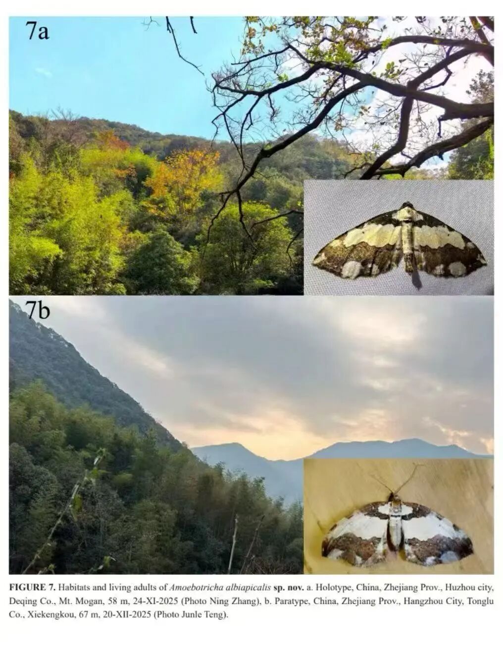 日前,上海市浦东新区青少年活动中心张宁昆虫工作室在蛾类多样性调查中取得重大突破,其团队成员在浙江莫干山和桐庐富春江灯诱蛾调时发现了一种全球从未被描述过的蛾类新物种——白端浪缘尺蛾Amoebotricha albiapicalis Kang, Zhang & Teng, 2026。这一珍贵发现填补了该属分类学的空白,具有重要的科研价值。